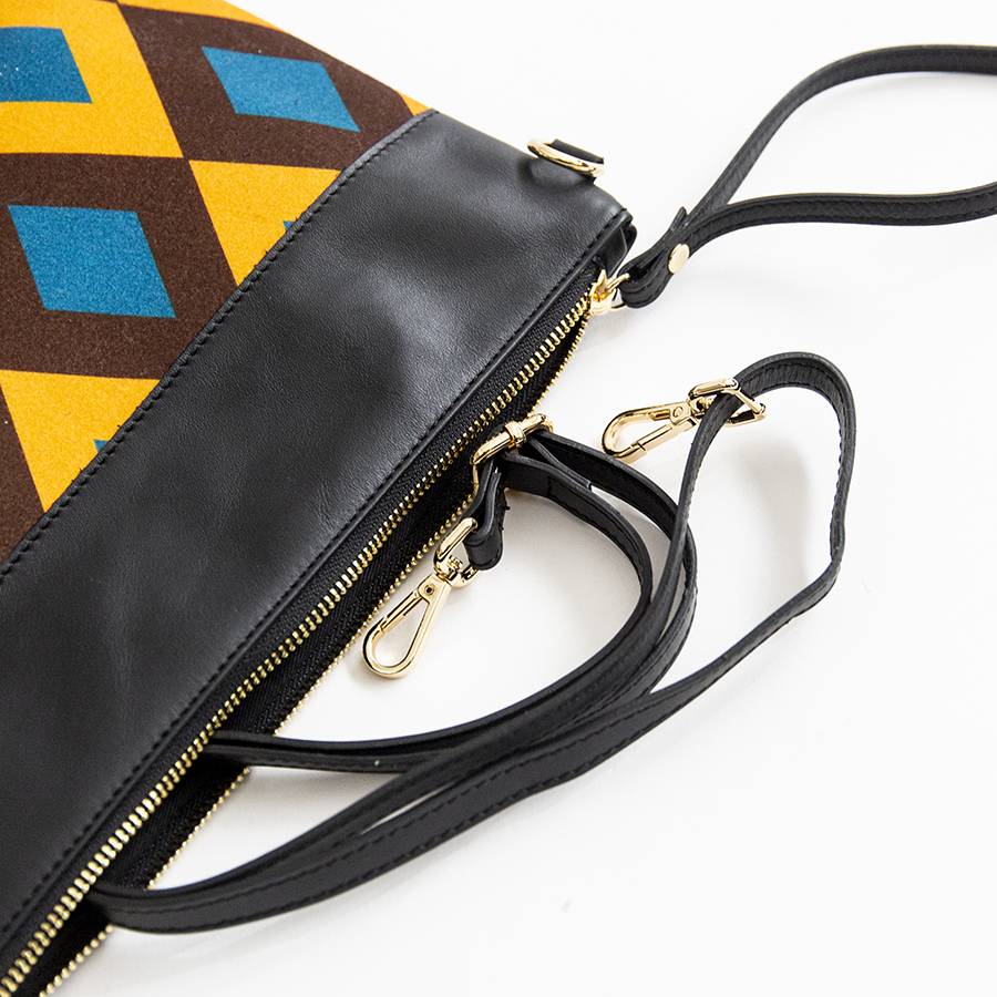 Busta di medie dimensioni in tessuto stampato geometrico con bordo in pelle soft nera. Chiusura a zip, interno foderato. Manico a mano e tracolla regolabile in pelle.