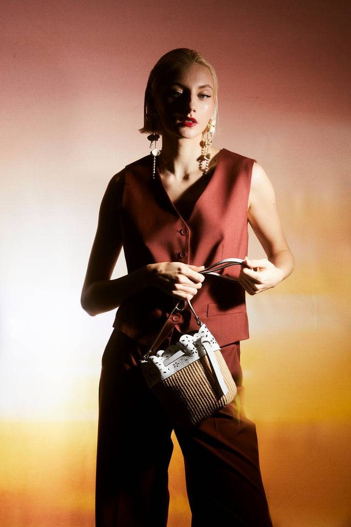 Roberta Gandolfi Diletta Mini Bucket in rafia con balza in pelle laserata con tracolla staccabile Super Saving Price