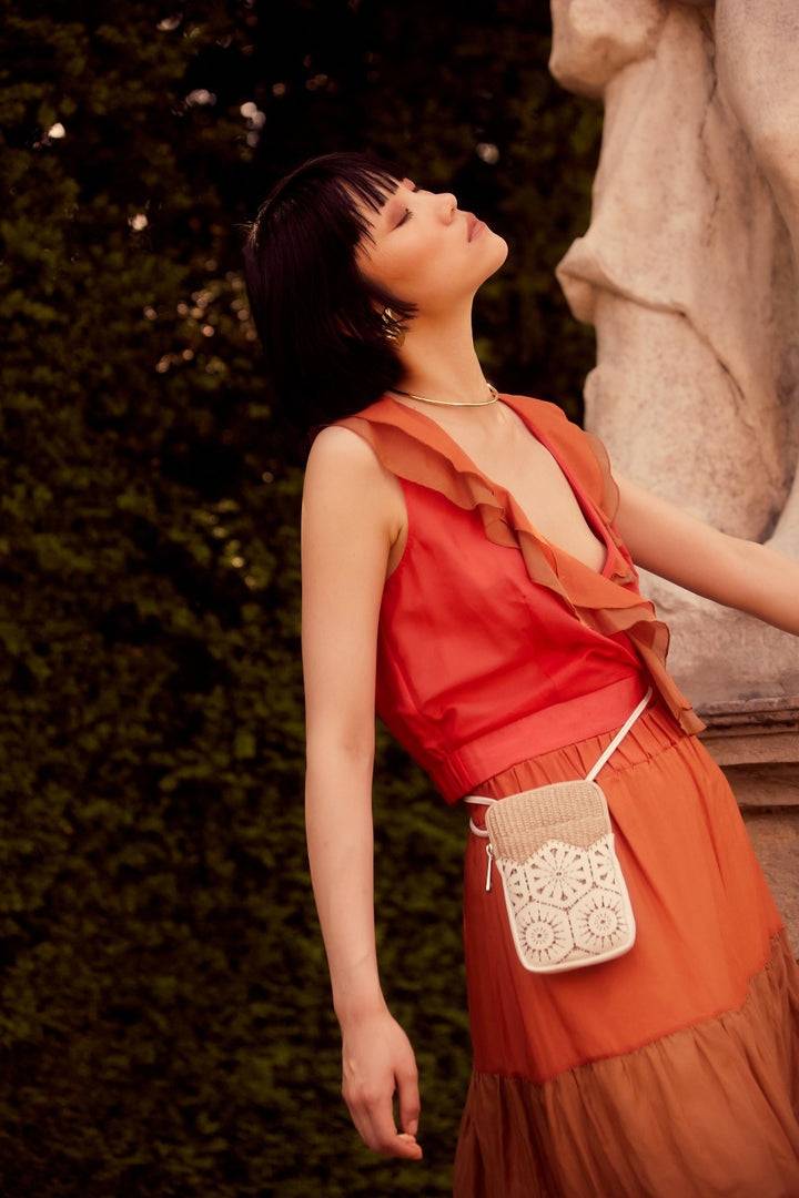 La texture naturale del tessuto effetto paglia incontra la pelle sapientemente tagliata al laser dando vita ad un disegno che richiama il pizzo geometrico.Il pannello di pelle viene abilmente cucito a mano con un filo di raffia per esaltare e mettere in evidenza la silhouetteIl modello è chiuso da una zip ed è dotato di una tasca esterna aperta sul davantiOltre al cellulare può anche contenere un mini portafoglio/portatessere o altro a piacereStaccando la tracolla può diventare una comoda pochetteScheda TecnicaMateriale : tessuto effetto paglia (52% cotone – 48% nylon) con finiture in pelle di vitelloFodera : Tessuto (65%Co, 35%Pl)Chiusura: zipColore accessori metallici : col. Nikel Misure: 11 x 17,5 x 2 cm (lunghezza x altezza x profondità) Lunghezza spallaccio regolabile : 140 cmLuce manicimin/max : 14/25 cmPeso : 120 grCuraPulire con panno morbido