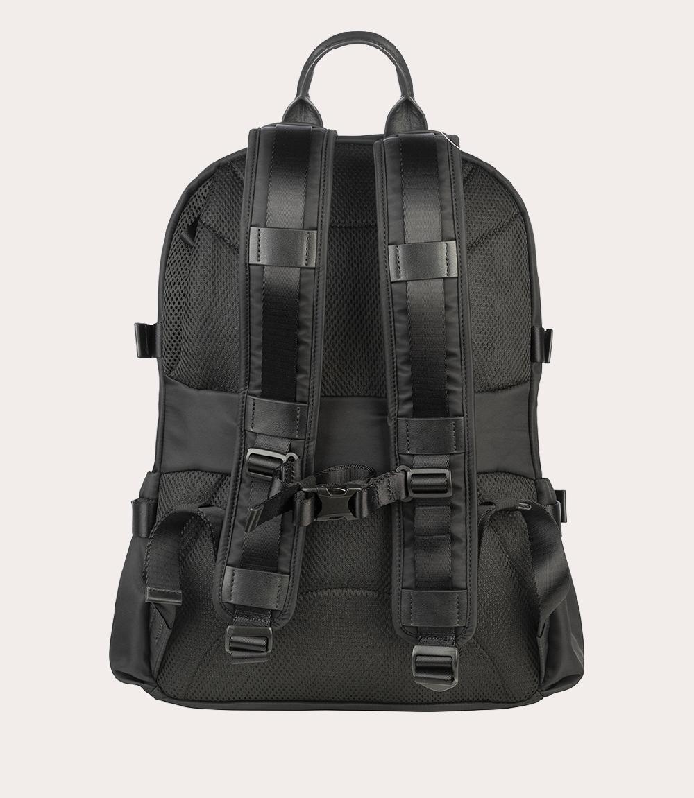 Zaino business-sportivo in nylon riciclato e dettagli in pelle, con vano interno dotato di doppia tasca protettiva per laptop 15.6, MacBook fino a 16" e tablet. Il doppio scomparto separato da cerniere offre spazi ampi e bene organizzati. Arricchito da due comode tasche sul pannello frontale, lo zaino Desert Premium ha un'ottima organizzazione delle tasche interne, uno schienale ergonomico con tasca di sicurezza e una fascia per l'aggancio al trolley.